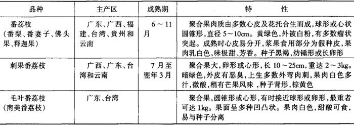 番荔枝是番荔枝科番荔枝属的灌木或小乔木,我国台湾早在300多年前就开始栽培。番荔枝(Sugar-apple,Sweet sop)是世界五大名果之一,果外形由多数圆形心皮合生而成。颇像荔枝,故称番荔枝。番荔枝属的品种有90多种。目前我国栽培的番荔枝有5个品种,即番荔枝(Anona squamosa L.)、刺果番荔枝(A.muricata L.)、毛叶番荔枝(A.cherimola L.)、牛心番荔枝(A.reticulata L.)和平滑番荔枝(A.glabra L.)。主要品种及其特性见表1-2-28。
