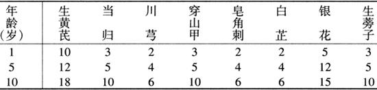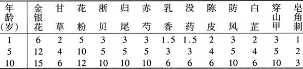 【歌诀】 五味消毒饮,银花野菊花, 天葵蒲紫地,痈肿效无差。 〔按语〕本方主治疖疔初起。方中重用银花为主药,该药甘不伤胃,外清气分之毒,内清血分之毒,为治疮痈之圣药。五味药均有清热解毒、消肿散疖的作用。原方设计煎煮时加烧酒少许,煎后热服,药借酒势,以通血脉,服后盖被,微微出汗,以开皮毛,逐邪外出。当今加酒合煎者较少,特别是对幼小之儿。现代医学研究证明,蒲公英对金黄色葡萄球菌及溶血性链球菌等有杀灭作用,银、翘、紫有广谱抑菌作用,野菊花有抗金黄色葡萄球菌作用。头面部疔疮因病情较重,除用大剂量清热解毒药以防热毒深入外,还可加①、②以引药上行,加③、④凉血清营,便秘加⑤。 〔方药二〕黄连解毒汤(见第三章新生儿硬肿症节,其用药剂量应随年龄增加)。 〔按语〕本方主要用于热毒甚者。方解见第三章新生儿硬肿症节。现代医学研究本方中四味药均有广谱抗菌作用。 (二)疖疔成脓 〔证候〕疖肿逐渐增大,顶部出现黄白色脓头,发热,恶寒。舌苔黄或黄腻。脉滑数。指纹紫滞。 〔治法〕清热解毒,消肿排脓。 〔方药〕仙方活命饮(曾用名:清疮饮)。