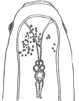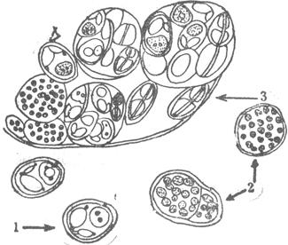 图 35 1.孢子 2.营养体 3.胞囊膜(仿吴宝华等) |
