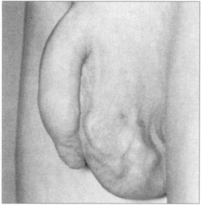 图217 切除的睾丸肿瘤 (2)阴囊疼痛 睾丸扭转会引起一侧阴囊的剧痛,通常突发,患者常于数小时后就诊。可有类似轻微、自行缓解的前驱症状出现。扭转对十几岁的男孩都会造成影响。一侧阴囊的疼痛也可由睾丸鞘突的扭转或创伤引起,但是除了最严重的状况外,创伤性的疼痛都会很快缓解。对成年人,持续性的睾丸疼痛通常是附睾-睾丸炎引起的,可伴随肿胀、疼痛,有时有发热。近期可出现尿频、排尿困难,提示有尿路感染,如果患者有长时间的尿频、夜尿、尿流少及终末淋漓的症状,则提示有膀胱流出的梗阻。 (3)包皮疾病 在9岁之前包皮不能上翻是正常的。此年龄以下,不能上翻、排尿时膨胀、包皮外口轻微的间歇性疼痛都不是包皮环切的适应证,只有伴随包皮下脓性排出的明确感染病史和明显的瘢痕(纤维化包茎)时,才考虑环切。对成人来说,包皮不能上翻是不正常的,通常会造成卫生问题和影响性生活,需要进行环切。 包茎嵌顿是指由于远端包皮上翻引起的肿胀(图218)。其有不适和困窘感,也会发展为溃疡。如果吸出水肿液仍不能还原包皮,则需要紧急进行环切术。
