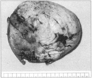 图215 精索静脉曲张 睾丸本身的肿瘤则可能是恶性的(图216)。不同于其他实体性肿瘤,睾丸肿瘤发生于青年时期,畸胎瘤的高发年龄在20~30岁之间,精原细胞瘤发病较之要晚10年。虽然有轻微的疼痛,通常却没有相关的疼痛出现。阴囊创伤的病史并不可靠,因为有时这会引起对先前肿块的注意。存在的睾丸恶性病变通常都没有症状。切除的睾丸肿瘤如图217。