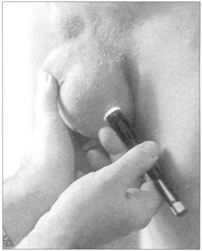 图218 包茎嵌顿,包皮上翻、龟头肿胀 所有常见的皮肤疾病都可以发生在阴茎上。对于疣或有梅毒可能的下疳病例,需要采集性接触史。阴茎癌通常发生于龟头和包皮之间的沟。其在西方和环切术后的男性少见。其可以表现为肿块或者包皮下血性或感染性的排泄物。包皮通常不能上翻,但是这很有可能是发生阴茎癌的原因之一而不是并发症。 (4)其他阴茎疾病 关于阴茎疾病的询问应该是非常细心的,因为通常患者是很困窘的。 尿道下裂是一种先天性畸形,其尿道开口比正常要近。轻度的尿道下裂不引起问题,或只有尿液喷溅的症状。而开口于阴茎体甚至阴囊上会导致严重的排尿和性功能障碍。会引起勃起疼痛(阴茎弯曲)。尿道下裂的患者通常会有不正常的“背侧”包皮,但绝对不能环切,因为其在重建的手术中会用到。 (5)Peyronie ’s病是一种影响阴茎体的局部的纤维瘤病。它会引起阴茎勃起时弯曲,从而影响性功能。其可能与Dupuytren’s挛缩有关,但却找不到相关性的因素。 尿道分泌物通常伴随排尿困难,常由衣原体感染和淋病引起。应该采集性接触史,并嘱患者于性病门诊就诊。 8.3.2 患者检体 患者应该取仰卧位,完全暴露腹部和生殖器。 (1)视诊 这一步包括腹部(包块、充盈的膀胱),腹股沟区(疝、淋巴结)以及阴茎和阴囊。通常患者所述的病症应该立即能看出。对成人和青年人,应该上翻包皮检查是否有包茎和潜在的病症。如果有包茎而不能上翻,则应该考虑环切。 (2)触诊 阴茎的触诊可以辨出Peyronie’s氏病患者阴茎体纤维化的部分,但对大多数疾病意义不大。阴囊内容物的触诊目的是辨别正常的结构及异常情况与这些结构的关系。应该用双手轮流固定每个睾丸。睾丸本身很敏感,应该轻柔触摸。睾丸呈均一、柔软的固性状态,注意可能提示肿瘤的散在包块和硬化部位。年长的人的睾丸弥漫肿大和较剧烈的触痛可能提示睾丸炎。此外,触诊时注意保护病人的隐私。 附睾应该在睾丸后被触到。正常应该是柔软的,但有附睾炎时可以肿胀、硬化和触痛。如果炎症轻微,这些改变可以是限局性的。附睾上极的柔软结节可能是扭转的睾丸鞘突。 对积液的患者,睾丸鞘膜内的液体可能使睾丸本身触摸不到。正常的附睾应该可以从后面触摸到。附睾囊肿都出现于睾丸后面,可能会使附睾余下部分触摸不清,但正常的睾丸应该在前面触摸到。这两种疾病开始都可能与腹股沟阴囊疝相混淆,但可以通过精索的触诊鉴别开来。由腹股沟疝导致的肿胀是不可能触及上面的,而在积液和附睾囊肿的上面却可以用四指和拇指触及正常的精索。 除了触诊,阴囊肿胀还可以在暗室中用笔式手电进行透光检查(图219)。对积液和附睾囊肿,当光源置于其后时会发亮。这一实验证明肿物是充满液体的,可以将其与临近正常的睾丸区别开来。该实验还可以将其与疝鉴别开来(虽然通过触诊已经可以鉴别),但是对于婴儿则不行,由于疝相对较小,也可以是透光的。