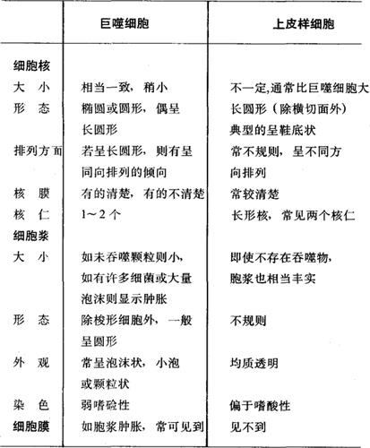| 释义 | 病理切片检查和解释 病理片镜检时,首先要注意切片的大小、厚度和染色深浅是否适当。过小的切片会影响判断的正确性。切片过小可能是原标本过小或切片时未能切到最大面,也可能是部分脱失。如属后两种情况,应予重切。切片厚度不标准,对判断浸润细胞的密度和量以及判断细菌指数都会有明显影响,并使不同时制作的片子的对比失去意义。片子着色不正常,也会影响判断,如嗜酸或嗜硷变性的判断与染色就有很大关系。苏木素染色过浓会产生浸润致密、量多的印象,伊红染色过淡会使泡沫结构显示度减低。 切片检查按先低倍(10×目镜)——甚至用4×目镜扫视、后高倍的原则。检查必须包括整个切片的每一个区域,并按一定的次序,如先左后右,先上后下,以避免遗漏。检查者应先客观地确认片内存在的各种病理现象。然后综合解释所见,最后才考虑诊断问题。与此同时不能忽视任何可能不是麻风病的证据。麻风病理的检查与解释的重点如下: 一、表皮和表皮下区 麻风皮损部的表皮一般不增生,晚期渐呈萎缩,表皮变薄,皮突消失,表皮与真皮以平面相接,这在晚期瘤型皮损尤为着明。表皮增生不是麻风病的特征,如果表皮明显增厚,甚至可以作为排除麻风病的参考条件。结核样型麻风表皮下区常有浸润,浸润与表皮相接,基底层和棘层不同程度地受到上皮样细胞肉芽肿的破坏,称为表皮侵蚀,通常见于2~3个乳头的一段表皮。浅而广泛受侵的情况少见。 早期或未定类损害。有时表皮内有呈楔状分布的淋巴细胞浸润。表皮内弥漫性细胞浸润不是麻风的典型病变。 当瘤型麻风皮损内有大量浸润时,浸润上缘往往不与基底层相联,从而形成一条表皮下空白区,称之为“无浸润带”。仅管这种“无浸润带”不是麻风所特有的,但它对麻风的诊断和分型有参考价值。如果真皮内只有轻度浸润,也即没有形成“无浸润带”的条件,这时“无浸润带”的有无就没有评述的价值。 二、肉芽肿和浸润 肉芽肿基本上是由巨噬细胞构成的密集的团块状病灶。因此各种肉芽肿细胞的核都相似,各种肉芽肿病理图象的差别在于它们的胞浆。这种差别是由于刺激抗原的不同以及免疫反应的差异造成巨噬细胞发展演变的方向和阶段的不同而形成的形态多种多样。检查中没有必要去判定每一个细胞的确切归属或阶段,本质在于识别肉芽和浸润整体图象的类型、发展方向及其表达的病理意义。 巨噬细胞和上皮样细胞的鉴别,对于组织切片的解释和麻风病的分型至关重要。低倍镜检查中辩认上皮样细胞最方便。表3-3所列仅是巨噬细胞和上皮样细胞的总体特征。 表3-3 巨噬细胞与上皮样细胞鉴别表