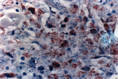 照片12 病理切片中的麻风菌(抗酸染色) 可见大量散在、聚集、甚至呈球团状的红染的麻风菌。 |