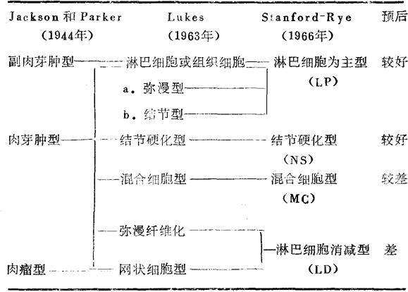 由于上述各种细胞的数量与排列的不同,构成了HD的不同类型及其预后关系。Stanford-Rye(1966)会议对何杰金氏病的病理组织学的重新分类,目前已被普遍采用。下面将三种组织学分类作相应的对照(表9-1)。