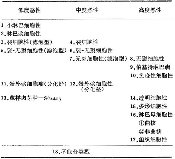 我国对恶性淋巴瘤的研究进展显着。1985年5月在成都召开了第四届全国淋巴瘤学术座谈会,并拟定了“非何杰金氏淋巴瘤工作分类方案”(简称“成都方案”表9-2)。