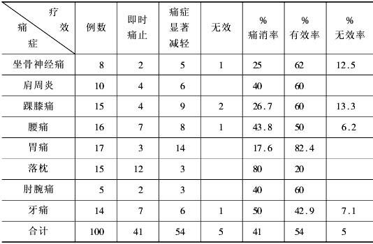 | 释义 | 痛症 【定义】痛症为临床常见症状,有很多疾病的发生、发展中均有表现,有时成为主症,疼痛轻者表现为不适,若痛持续不减,就会影响精神,饮食,睡眠等,疼痛剧烈则造成极大的痛苦,甚至危及生命。 【取穴】神门、交感、内分泌、耳尖、耳区相应部位或压痛点。 【方法】取耳尖穴,垂直进针后沿耳软骨向耳根方向缓慢进针0.5~1.0寸,患者耳郭有酸痛或微热感为度,针刺相应部位,同时嘱患者活动患处,再针刺神门向对耳轮上脚尽处进针,必要时再配内分泌、交感、和压痛区。 【疗效】应用上法治疗各种痛症100例。即时止痛者41例,疼痛显着好转者52例,无效7例,总有效率93%。详见附表。 【典型病例】男,33岁,腰痛2天,初诊时患者腰痛不能仰俯坐立,由二人扶架而来,痛苦难言,经用上法治疗疼痛即轻,留针20分钟后腰痛基本消失,自己走回家,复诊2次而愈。 耳穴治疗痛症100例疗效表