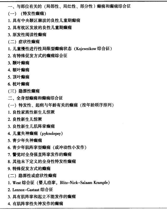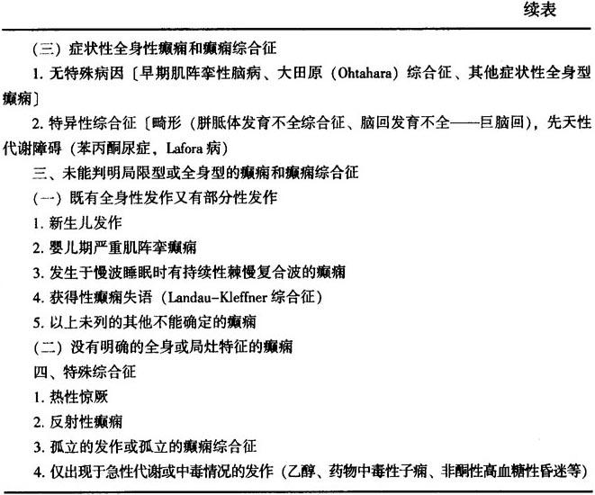 (二)癫痫和癫痫综合征的表现 参照1989年国际抗癫痫联盟的分类(表13-6),该分类方法复杂,相互之间可能有重叠。主要适用于儿童。痫性发作的分类与癫痫和癫痫综合征的分类不应混淆,前者是症状分类,后者是疾病分类,但两者互不矛盾,又有一定的联系。例如病人表现为复杂部分性发作,患有颞叶癫痫。癫痫和癫痫综合征的分类包括四个方面:①部分性(与部位有关)癫痫症(特发性、症状性);②全身性癫痫症(特发性、特发性和/或症状性、症状性);③不能确定为部分性或全身性的癫痫症;④特殊综合征(如高热惊厥、反射性癫痫等)。特发性癫痫主要的特点是,与年龄明显有关,发作相对稀少,神经系统检查无定位体征,无智力和发育方面的异常,神经影像学正常,对小剂量抗癫痫药反应良好,有明显的自愈倾向。症状性癫痫主要的特点是,年龄相关性不是非常明显,有比较明确的病因可循,发作比较多,癫痫持续状态发生率高,有神经定位体征,神经影像学异常,智力异常,精神发育障碍,部分有难治倾向。以下仅列举几种临床常见的癫痫和癫痫综合征。 表13-6 癫痫和癫痫综合征的国际分类