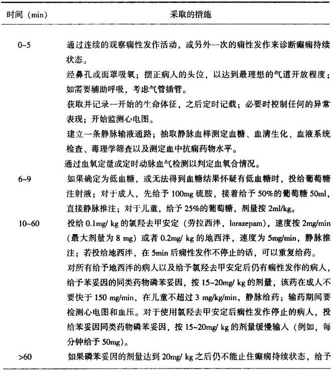(注:CPS为复杂部分性发作,1GTCS为原发性全面性强直阵挛发作,2GS为继发性全面性发作) 一些癫痫综合征不需要抗痫药治疗,如婴儿痉挛(West综合征)用抗痫药难以控制,仅有40%的患儿用丙戊酸有效。相反,用ACTH或强的松有效,皮质类固醇治疗其他类型的癫痫几乎无效。婴儿痉挛用氨己烯酸(Vigabatrin)非常有效。一些儿童难治性癫痫采用生酮饮食可有一定抗痫效果,但我国患儿很难接受。 (3)药物剂量 由小剂量开始,逐渐加量;做药物血浓度测定。要灵活掌握有效血浓度,根据临床表现调整抗痫药效果。 (4)单药治疗 尽量选择一种抗痫药进行治疗。还要考虑药源和经济问题;一种药物无效,可考虑加药或换药;两种药物不能控制可考虑加用第三种药物。多药减单法副作用大,难以掌握,尽量不用。药物的更换问题,原药逐渐减量,新药逐渐增量,一周内交替完毕。 (5)合并用药 避免使用作用相同的药物,如扑痫酮和苯巴比妥:药理作用相同;氯硝西泮和苯巴比妥:副作用相似。除考虑到抗痫药与抗痫药之间的相互作用外,还要注意到抗痫药与非抗痫药之间的相互作用。 (6)药物的副作用 癫痫治疗的成败多与药物的副作用明显相关,但没有一种抗痫药无副作用。最常见的副作用是胃肠不适、嗜睡、头迷和失调。这些症状多出现在用药的初期,苯妥英钠和苯巴比妥更易出现,采用小剂量开始,逐渐增量的方法可以避免这些副作用。用卡马西平时要从小剂量开始,几天后再达到有效剂量。加巴贲丁开始用药常有嗜睡和疲劳,一般经过几次服药后症状消失,应睡前服用。通常在开始服药的六周内出现特异反应(如皮疹),用丙戊酸、苯巴比妥或加巴贲丁皮疹的出现率大约为2%,卡马西平、苯妥英钠或拉莫三嗪大约10%。多数的抗痫药很少出现致命的造血和肝功损害,最多见能引起肝功损害的是丙戊酸和非尔氨脂,少见的易感体甚至可引起与丙戊酸相关的肝衰,用卡马西平和非尔氨脂有时可引起造血抑制。婴儿、多药治疗、先天性神经系统疾病、营养不良、代谢性疾病具有高度危险性,这些高危人群和有肝脏疾病者应慎用丙戊酸。有急性或既往造血抑制病史者禁用卡马西平。用卡马西平常引起短暂、可逆的白细胞减少症,但通常无临床意义,卡马西平引起再生障碍性贫血的危险性非常低。在使用抗痫药前,要化验血常规、肝功、肾功和血浆离子,其化验结果将影响抗痫药的选择。一些副作用发生在用药的任何时期,苯巴比妥常引起儿童行为障碍(如多动和激惹),引起成人嗜睡或认知功能障碍。苯巴比妥还可以引起肩手综合征、掌挛缩病和冻结肩,在老年人可增加摔倒和骨折的机会。 (7)停药问题 GTCS和简单分性发作,在完全控制2~5年后;失神发作完全控制6个月后可考虑停药问题;前者半年内停完,后者不少于3个月。两种以上的抗痫药,先停毒性作用大、半衰期短的药物;有神经功能缺失者,更应延长停药时间。突然停药容易诱发癫痫持续状态。有时候决定是否停药是一件相当困难的事情,决定开始用药和决定开始停药同样都是非常棘手的事情。在决定停药时参考下列因素,但任何的因素都是相对的,应具体问题具体分析。 停药后降低痫性发作复发的因素: 自动缓解的癫痫综合征 单一种类的痫性发作(肌阵挛除外) IQ正常 神经系统检查正常 痫性发作停止超过2年以上 16岁以前发生的痫性发作 停药后增加痫性发作的因素: 不能自动缓解的癫痫综合征 多种痫性发作类型,肌阵挛发作 智能发育迟滞 神经系统检查异常 痫性发作停止不超过2年(2年以内) 16岁以后发生的痫性发作。 2.发作时的治疗 要将病人侧卧,防止舌咬伤和跌伤,注意处理呼吸道分泌物,防止吸入性肺炎。 3.癫痫持续状态的抢救(见表13-11、表13-12、表13-13) 癫痫持续状态的治疗原则是尽快控制痫性发作、治疗原发病和防治并发症。其抢救应是统筹兼顾,具体情况具体分析,不能机械片面地追求止抽药效果。抢救过程中要严密观察生命指征,解决主要矛盾。同时做血钙、血糖、血尿素氮、电解质、血气分析。病情允许的情况下,还应做腰椎穿刺化验脑脊液、脑电图以及CT脑扫描,尽早明确病因。 表13-11 用于癫痫持续状态治疗所提议的时间表