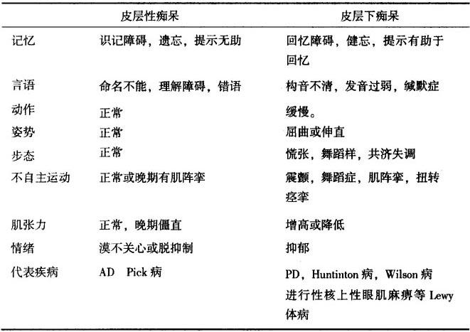 在临床上有时还遇到一些智能障碍的病人与痴呆有类似的表现,但其本质迥然不同,称之为假性痴呆。假性痴呆的概念多见于精神病学范畴,这类智能障碍主要由于强烈精神创伤引起,因而在大脑组织结构无任何器质性损害,病变的性质基本上是功能性的。发生时伴有意识障碍而出现的暂时性脑功能障碍,并非真正的智能缺损,它常突然发生,突然消失,属可逆性。一般持续时间短,但表现智能缺损的程度却比真性痴呆还严重,且智能障碍也先后不一致,如对简单问题不能正确回答,但对复杂问题反而可正确回答,还可伴有“故意做作”的惊异表情。行动似乎幼稚荒谬,但目光仍显机灵。常见有以下三种情况,癔症性假性痴呆、刚塞氏综合征和童样痴呆。痴呆与抑郁症也是鉴别诊断的另一个难点,尤其是与老年抑郁症的鉴别。此外,也有学者将假性痴呆扩大至更多的其他精神障碍的病人。 (三)不同病因痴呆的鉴别 在前面关于痴呆的诊断步骤中,也介绍了部分不同性质痴呆的特点。在临床上有人将痴呆分为皮层性痴呆和皮层下痴呆,以便于鉴别诊断(见表2-3)。二者的区分主要是依赖临床表现,虽然在某种意义上二者的不同与病变部位有关,但也不是绝对的,例如血管性痴呆、Lewy体痴呆就可能同时有皮层和皮层下脑结构的损害。至于混合性痴呆的概念有人是指同时具有皮层性痴呆和皮层下痴呆者,也有的是指AD合并血管性痴呆。 表2-3 皮层性痴呆与皮层下痴呆的鉴别