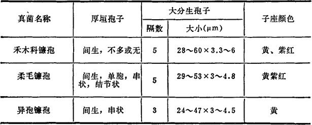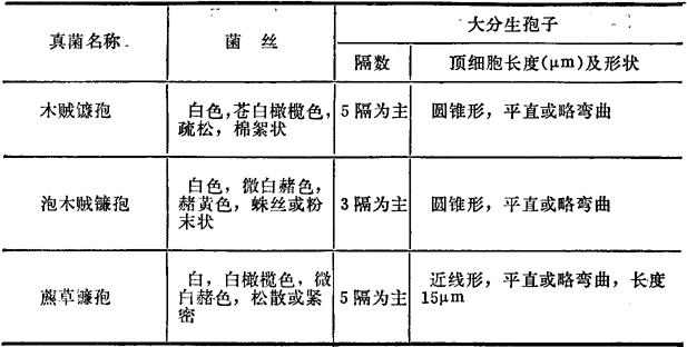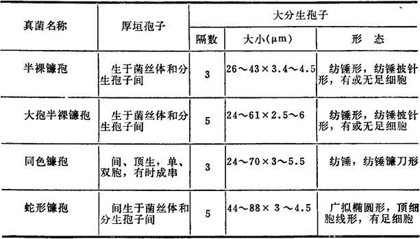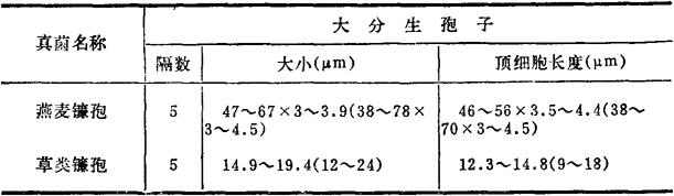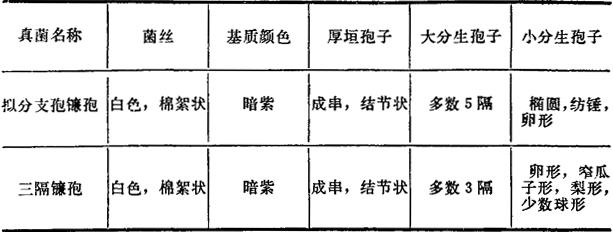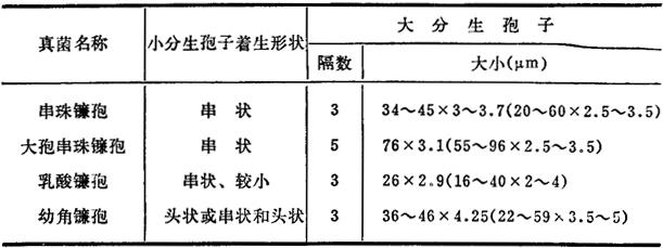 四、半祼镰孢(Fusarium semitectum) 本菌寄生于水稻、小麦等植物上,也可在土壤中腐生。产生3种毒素,即丁烯酸内酯、T-2毒素和二醋酸基藨草镰孢烯醇。毒素可引起牛末梢坏死和骨髓造血组织坏死。 1.真菌检查 (1)分离 见拟分支孢镰孢。 (2)形态特性 培养性状,气生菌丝白~赭色,子座肉桂色、黄肉桂色、深肉桂色。 镜检特性,厚垣孢子间生于菌丝和大分生孢子之间,单孢和串状,初平滑,成熟时具小刺。大分生孢子纺锤形,纺锤~披针形,少数为纺锤-镰刀形或椭圆-鳗状弯曲形或近平直,向两端逐渐变细,基部有或无足细胞,典型5隔,成堆时赭色。大小为:3隔29~30×4~4.21μm(26~43×3.4~4.5)μm,4隔33~52×3.5~4.5μm,5隔31~46×4.1μm,6隔44×4.1μm。 2.毒素检测(二醋酸基藨草镰孢烯醇) (1)提取 饲料样品以2倍剂量正己烷脱脂,然后用4倍剂量甲醇-1%氯化钠(55∶45v/v)振荡提取30min,离心,上清加等量正己烷,振荡5min除掉干扰物质,水、甲醇层溶液加等量三氯甲烷振荡提取3次、三氯甲烷层水浴至干,贮冰箱备用。薄层层析时加少量三氯甲烷溶解。 表21-4 四种真菌的鉴别表