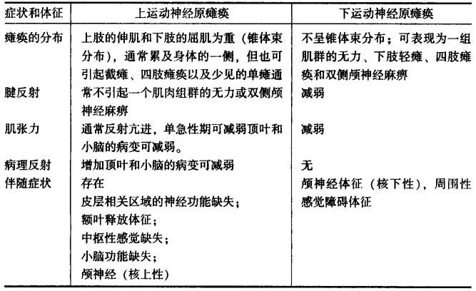 四、上下运动神经原瘫痪 上下运动神经原瘫痪的鉴别诊断见表30-2。 表30-2 上下运动神经原瘫痪的鉴别诊断