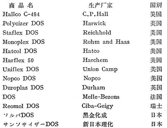 O=相容 △=部分相容 x=不相容 用途 本品为一优良的耐寒增塑剂,主要用于聚氯乙烯、氯乙烯共聚物、硝酸纤维素、乙基纤维素及合成橡胶等。本品增塑效率高,挥发性低,既具有优良的耐寒性,又有较好的耐热性、耐光性和电绝缘性,特别适用于制做耐寒电线和电缆料、人造革、薄膜、板材、片材等制品。但本品迁移性较大,易被烃类溶剂抽出,耐水性也不太理想(但比DBS好),因此,常与邻苯二甲酸酯类并用。本品还可作为多种合成橡胶的低温用增塑剂,对橡胶的硫化无影响。 毒性 本品毒性系数T=1000。以200毫克/公斤体重的剂量掺混到饲料中,喂饲大白鼠19个月,未见任何致毒作用,亦无致癌性。 美国(参见FDA121.2500,121.2531)、法国、日本、意大利、联邦德国和英国允许本品用于食品包装材料中。 国内生产厂 吉林市石井沟联合化工厂 上海溶剂厂 北京化工三厂 天津中河化工厂 沈阳新城化工广 邯郸市化工厂 重庆朝阳化工厂 天津溶剂厂 南宁有机化工厂 哈尔滨化工四厂 本溪有机化工厂 开封化工三厂 陕西省兴平县油漆厂 国外商品名
