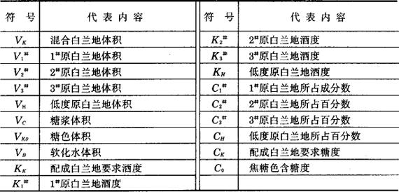 根据前苏联的资料介绍,制造普通白兰地所用的原白兰地贮存3~5年。如“三星牌”白兰地所用的原白兰地贮存不少于3年;“四星牌”白兰地所用的原白兰地不少于4年;“五星牌”白兰地所用的原白兰地贮存不少于5年。 名牌白兰地或贮存白兰地是用6年至10年的原白兰地配成的。 同样的原白兰地贮存的期限,决定白兰地的称号和质量。贮存的期限越长,白兰地的质量越好,等级也越高。法国政府有关部门规定,从葡萄收获加工成白兰地原料葡萄酒到第二年的3月31日,为原白兰地正常的蒸馏期。从第二年的4月1日起计算白兰地的贮存时间。即从第二年的4月1日到第三年的3月31日,为第一年的贮存期。从第三年的4月1日到第四年的3月31日为第二年的贮存期,依此类推。 法国科涅克白兰地分为以下几个等级: (1)V.S.又叫三星白兰地。 (2)V.O.,V.OP.,V.S.O.P.为多年贮存的白兰地。 (3)X.O.,Extra,Napoleon为时间很老的陈年白兰地。 法国法令规定,三星白兰地贮存期在3年以上。V.O.,V.OP.,V.S.O.P.,必须使用贮存期5年以上的原白兰地调配。V.S.O.P.白兰地的平均酒龄一般在7~10年,它已具有较好的葡萄品种香、酒香和橡木桶陈酿香的特征。X.O.,Extra,Napoleon等,酒龄更长,必须使用10年以上的原白兰地调配,平均酒龄在15~25年。法国政府只是对科涅克的分级标志作了大概的分类,规定了最低的贮存年限。不同的酒厂对产品分类标志和年限规定不完全相同,并多使用自己的牌子和分类标志。 白兰地生产时,除了几种不同质量,不同酒龄,不同度数的原白兰地互相勾兑以外,还要根据配制白兰地要求,调入一定数量糖浆、糖色,并调入一定数量软化水,使白兰地调到需要的度数。前苏联生产白兰地时,还勾兑入一定比例的低度原白兰地。低度原白兰地一般酒精含量在20~25%(V/V),是由平均酒龄符合该牌子白兰地要求的原白兰地,用软化水冲淡后,在橡木桶里贮存60~70天即成。 当需要配制的白兰地体积已定,酒度已定,所用几种原白兰地的酒度和百分比也已确定,并且给定了配成白兰地要求的糖度时,即可进行配酒计算。 为了叙述方便,给定条件的符号及其所代表的内容如表5-3-19所示。 表5-3-19 白兰地计算常用符号及代表内容