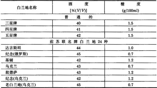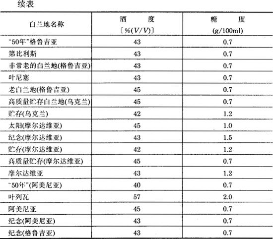 添加糖浆的体积数: Vc=VK·CK-VK0·C0=10000×1.2%-40×35%=106L 需添加软化水体积: VR=VK-V1#-V2#-V3#-VH-VC-VK0 =10000-646-4500-350-2100-106-40=2258L 不同的白兰地糖度和酒度也不同。前苏联生产的白兰地一般含酒精度为40~45度,含糖0.7~1.5g/100mL,如表5-3-20所示。 表5-3-20 前苏联几种牌号白兰地的酒度和糖度