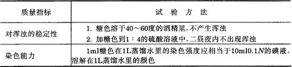 白兰地仅仅靠勾兑是不行的,还需进行必要的调配。白兰地香味不足,要适当地调香。白兰地口味不醇厚,可以适当地调糖。白兰地的颜色不深,可用焦糖色来调整。 糖色质量的好坏,对白兰地的质量有着非常重要的影响。糖色的质量,主要是检查糖色的稳定性和染色能力,如表5-3-21所示。 表5-3-21 糖色质量的检查