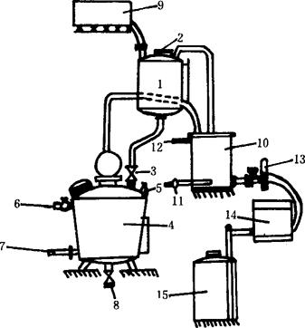 图5-3-3 用间接蒸汽加热的夏朗德式设备系统 1-预热器 2-装料孔 3-进料阀 4-蒸馏锅 5-空气阀 6-进汽阀 7-排汽阀 8-排糟阀 9-高位压力槽 10-冷却器 11-进水阀 12-出水阀 13-验酒器 14-泵酒器 15-贮酒桶 夏朗德式蒸馏设备属于两次蒸馏设备,即白兰地原料酒用这种蒸馏设备需经两次蒸馏,才能得到质量好的原白兰地。如果将间接蒸汽加热的夏朗德式蒸馏锅稍加改进,把锅上部的球形分馏器改换成两个透镜形的分馏盘,就可使两次蒸馏变成一次蒸馏。球形分馏器是用空气冷却的,冷却效率不高,低度酒的回流量少,因此一次蒸馏不能得到高度酒。而分馏盘是用自来水冷却的,可以通过调节自来水流量的大小,来控制低度酒的回流量。进入分馏盘的低度酒的蒸气,冷却后又回流进锅内。而浓缩后的高度酒的蒸气,经分馏盘继续上升,经过预热器和冷却器,形成高度酒被蒸馏出来。白兰地原料葡萄酒,经过这种设备系统的一次蒸馏,就可得到原白兰地。所以带分馏盘的蒸馏设备,又叫直接蒸馏设备或叫一次蒸馏设备。分馏盘的构造如图5-3-4所示。