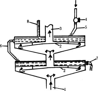 图5-3-4 碟形分馏盘 1-进汽管 2-隔板 3-排汽管 4-阀门 5-连接管 6-流水管 7-出水管 8-温度表 带两个分馏盘的一次蒸馏设备,整个系统如图5-3-5所示。