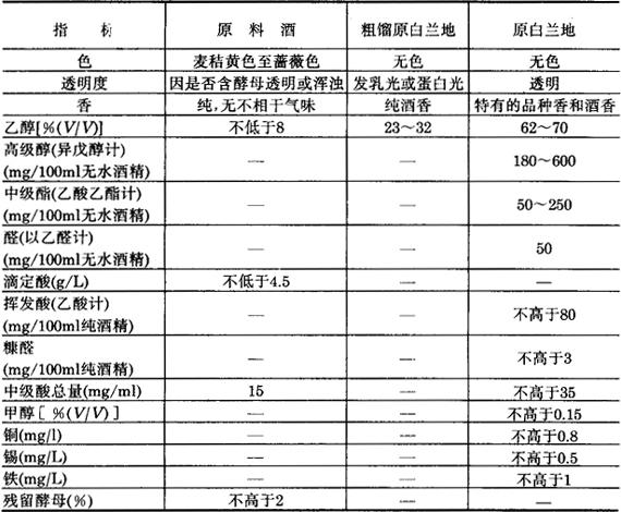 原白兰地的成分,随着最初的原料葡萄酒生产的地区和蒸馏方法的不同而不同。原料葡萄酒、粗馏原白兰地和原白兰地的技术要求列入表5-3-8。 表5-3-8 原料酒、粗馏原白兰地、原白兰地的技术要求