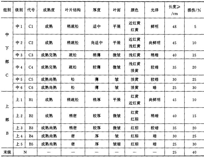 | 释义 | 白肋烟的检验 (一)取样 现场检验取样、品质检验取样、含水率检验取样、沙土检验取样及熄火烟检验取样均与烤烟检验取样相同,见本章一之(一)。 (二)品质检验 品质检验以感官检验为主,按白肋烟的品质规定(表8-1-2)逐项检验,检验方法与烤烟品质检验方法相同,见本章一之(二)。 表8-1-2 白肋烟的品质规定