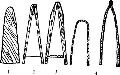图3 剥皮与皮板清理 剥下的筒皮,可按原样脖朝上、臀朝下套在撑皮架上,去掉残肉脂肪,让其自然伸展,挂在阴凉通风处晾干。 如剥下的是板皮,应用钉子将其四角及四边伸展钉在墙上或木板上,木板的大小视兔皮大小而定,然后放到阴凉通风处晾干。 5.撑皮架的制作(图4) 撑皮架可用8号铅丝或宽2~2.5厘米、长1.3~1.5米的竹片制作,制作竹片皮撑时,先将竹片放温水中浸一浸,然后用麦秸火将中间烤热,中间呈8~10厘米弧形,弯成“∩”形,即成撑皮架。撑皮架可根据皮筒大小将两头用绳子拉紧或放松。注意制作的撑皮架要将四边刮光滑,不留竹刺,以免扎破皮张。