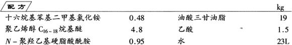 制法 在反应锅内加入水23L,加热至70~75℃。在1.5h内加完十六烷基苯基二甲基氯化铵、聚乙烯醇烷基醚和聚羟乙基硬脂酸酰胺。然后控制温度在60~65℃下搅拌加油酸三甘油脂。再搅拌2h,再加入乙酸搅拌均匀,即成产品。 本品为乳黄色胶液,对酸、盐溶液和硬水较稳定,是属于弱阳离子型皮革加脂剂。 |