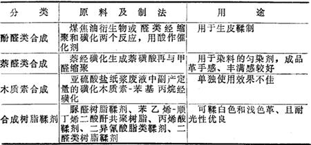 | 释义 | 皮革化学制品 从动物体上剥下的鲜皮,或叫生皮。从生皮到成品革的全部加工过程都需要借助于化学品,这些化学品主要为皮革鞣剂、加脂剂、涂饰剂和其他助剂等。这里仅介绍鞣剂。 1.合成鞣剂分类(表16-81) 表16-81 合成鞣剂分类