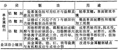 具有鞣革性能的药剂或物料称为鞣剂(料)。鞣剂具有使裸皮中的蛋白质形成化学交联,使皮转为革的能力。 2.金属鞣剂分类 金属鞣剂有两个特征;为络合物和其盐类都具有水解性,形成盐基性络盐;具有与皮质蛋白结合性能。金属鞣剂分类见表16-82。 表16-82 金属鞣剂分类