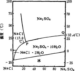 | 释义 | 盐析脱水法 盐析脱水制无水硝于1922年在加拿大获得专利权。该法是在芒硝的饱和或接近饱和的溶液中加入某种盐析剂,借助同离子效应,降低Na22SO4的溶解度,使Na2SO4的结晶析出。盐析过程可用Na+//Cl-,SO42--H2O体系的相图理论进行分析。 Na+//Cl-,SO42--H2O体系的相平衡数据见表6-4-17。根据该表数据绘制的Na+∥Cl-,SO42--H2O体系多温投影图见图6-4-16。