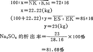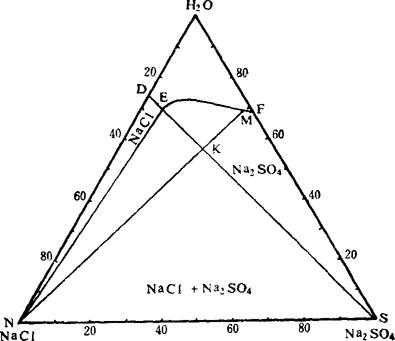 图6-4-17 50℃时盐析过程相图分析 在图6-4-17中,DE为NaCl饱和线,EF为Na2SO4的饱和线,E点为NaCl和Na2SO4的共饱点,N点为NaCl的固相点,S点为Na2SO4的固相点。根据硝液的组成标在图上为M点,恰在EF线上,说明该硝液对Na2SO4是饱和的。向硝液中加入NaCl后,体系点将沿MN线向N的方向移动,其液相点将沿ME线向E的方向移动。当体系点移到K点时,液相点移动E点,此时溶液对NaCl也饱和。如再增加NaCl量时,液相点仍在E点不动,体系点将由K向N点方向移动,固相点将由S点向N点方向移动。由上面的分析看出,硝液与NaCl的配料点必须控制在MK线段范围内,此时平衡的固相只有Na2SO4,而且配料点应尽量靠近K点,使Na2SO4析出量为最大。 设100kg的硝液加入x(kg)的NaCl,析出y(kg)的Na2SO4,其理论计算如下:
