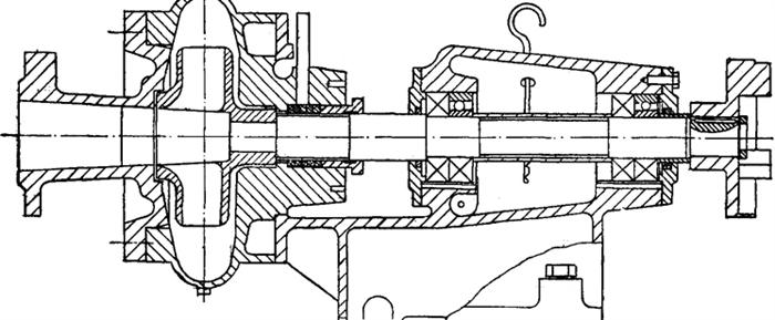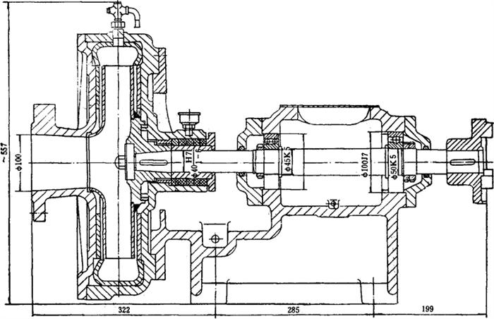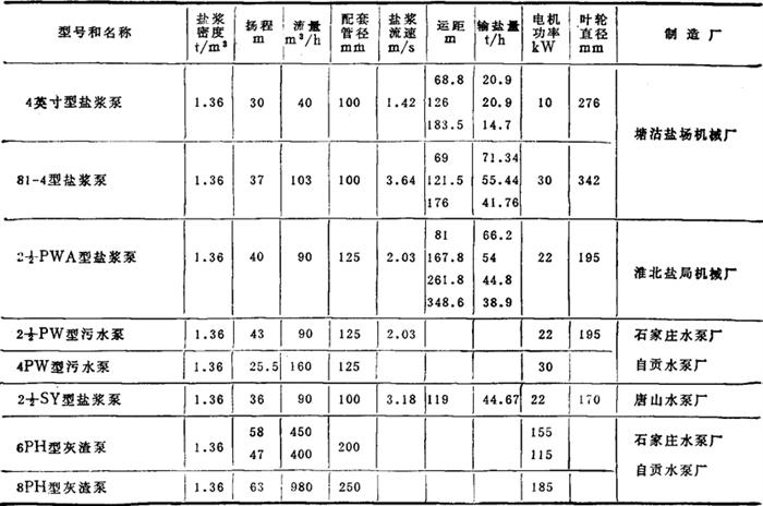 目前盐业使用的有专用盐浆泵,如4in型、81-4型和PWA型,最近唐山水泵厂又为盐业试制了一种SY型盐浆泵;另外也选用通用杂质泵作盐浆泵,如PW型、4PW型、6PH型和8PH型。各种盐浆泵工作性能见表2-8-11,部分盐浆泵结构见图2-8-16和图2-8-17。