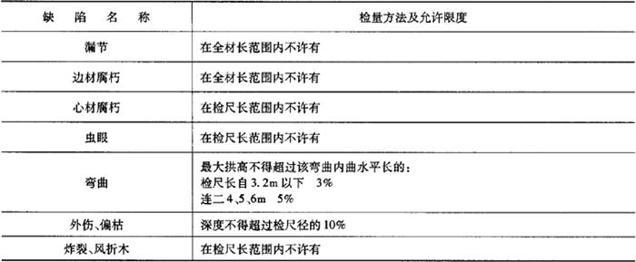 注:对地方矿井,经供需双方商定可供应检尺长自1.4m起,检尺径8~10cm的坑木。 3.材质指标(表4-2) 表4-2 直接用原木、坑木的材质指标