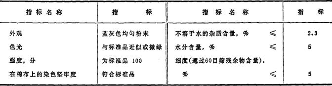 性能 蓝灰色粉末。溶于水呈蓝色,微溶于溶纤素,难溶于乙醇,不溶于其它溶剂。遇浓硫酸呈蓝灰黑色,稀释后呈红光紫色沉淀。水溶液加浓盐酸呈蓝色沉淀,加浓氢氧化钠溶液则呈紫色沉淀。对纤维素纤维染色染料吸尽性还好,拔染性很好。 质量规格 HG2-306-80