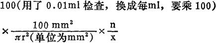 一、细菌总数测定 (一)用血细胞计数器计算 用计算白细胞的吸管吸取菌液(如为活菌,小心)至0.5记号处,再吸稀释液(0.2%升汞水溶液100ml中加浓盐酸2ml和石炭酸一品红两滴)至11记号处,摇匀后弃掉前几滴,然后滴一滴在计算室内,加盖玻片,15min后计数,最少计20小格,求得一小格中细菌平均数,再乘以80000000,即为每ml的细菌总数。因为计算室每小格的长、宽均为1/20mm,高度为1/10mm,故每小格容量为1/20×1/20×1/10mm3,即1/4,000mm3,即1/4000000ml,又因菌液曾在吸管中稀释20倍,故每小格中的细菌数,实际相当于1/80,000,000ml中的细菌数,故乘80000000为每ml中的细菌总数。如菌液太浓,计数不便,可以稀释百倍或千倍以后再进行计数,最后再乘以100或1000。 (二)显微镜直接计数 以牛乳为例将计数方法介绍如下。 1.抹片制备 取一纸片,画一方格,面积为100mm2。放载玻片于纸上,使方格位于玻片中央,以微吸管吸取0.01ml牛奶(或其他被检菌液),以方格为界使均匀涂布于玻片上,置室温干燥。 2.染色 干燥玻片以甲醇固定(可用染色缸)30s,转移到二甲苯中2min以去脂肪(无脂肪的菌液可免去二甲苯这一步骤),再浸于酒精中2min以去二甲苯,水洗去酒精,用骆氏美蓝染30s(其他染料亦可),水洗,干燥。 3.计数 用测微器测出所用油镜的视野半径,则每视野的面积为πr2。整个被检菌液为0.01ml涂布于100mm2的面积上,则100mm2面积上将具有100mm2/πr2(单位是mm2)个πr2的视野。计算x个视野(一般为100或50个视野)中的细菌数,假设其总数为n,则平均每视野具有n/x个细菌,故每ml被检菌液中的细菌总数计算公式为: