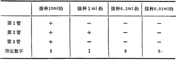 二、活菌数测定 (一)倾注平皿法 此法很常用。取灭菌试管9支(含菌数如不很多,可少),内有灭菌盐水9ml,取1ml被检菌液加到第一管,混匀后取1ml加入到第2管,同时从第1管再取1ml置1号消毒的空平皿中;换吸管,将第2管中的菌液混匀,从第2管中吸1ml置于2号消毒空平皿中,又取1ml加到第3管;换吸管,依次操作。则1~9号平皿中均有1ml的稀释菌液,其稀释度为10-1~10-9。向各平皿中加入融化后冷至45℃的含琼脂而又宜于被检菌生长的培养基,与菌液充分混匀,凝后置37℃培养24小时(生长慢的细菌可延长),选菌落为30~300的平皿计菌落数,乘以稀释度,即为1ml中的活菌数。每一试管中的菌液也可做2个、3个平皿的重复,计算时取其平均数。 (二)最大可能值法,简称MPN法(系Most Probable Number的缩写) 将被检菌液分别取10ml、1ml、0.1ml、0.01ml接种到适宜的液体培养基中,每一个量接种三管,即10ml的接种三管、1ml的接种三管……。培养基的量应是接种量的九倍以上。有9ml或10ml的培养基,可供接种1ml、0.1ml、0.01ml之用;而供接种10ml的被检菌液的培养基,要就是90ml以上(用三角瓶),要就是用50ml体积的大试管,盛以双倍浓度的培养基10ml,加入10ml被检菌液后变成20ml总量的正常浓度培养液。 接种好后,培养24~48h,取出观察各管有无细菌生长,有生长者记+号,并得出不同接种量的各自的3管中有几管有细菌生长,据此得出一个数字,根据数字查表,便得出被检菌液中所含活菌的最大可能值。 表7-1 接种对照表