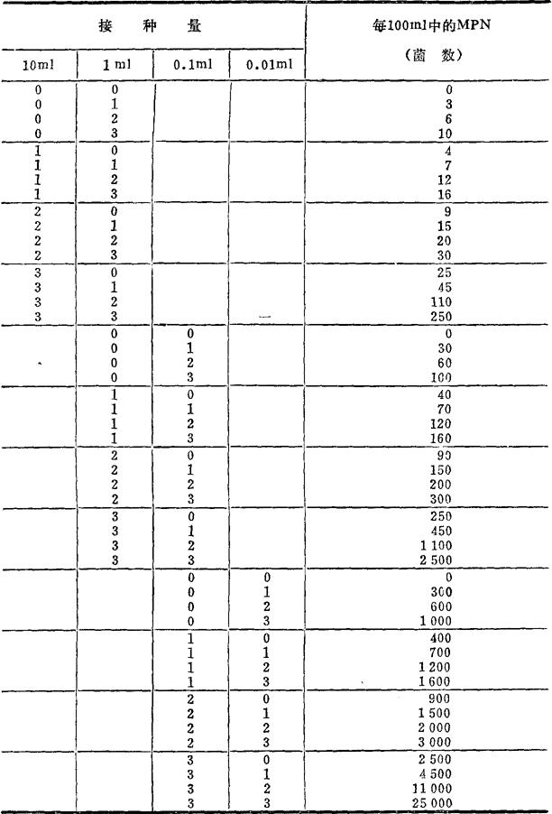 查表,3100这一数字,取前两位31,被检液中每100ml含菌数最大可能是45个。若数字为3331,则取后两位31,查表为4500个/100ml。若数字为3333,则应重做,从0.01ml做起,加做0.001ml、0.0001ml及0.00001ml,仍可用此表查,查出的数字要乘以若干个10倍,如0.0001ml及0.00001ml的数值,用表上0.1ml及0.01ml的数值,则乘以 表7-2 100ml中被检菌数的MPN表