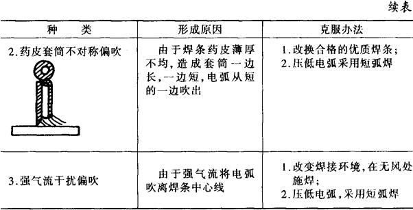| 释义 | 直流弧焊时电弧偏吹及克服办法 焊接电弧偏离焊条中心线的现象称为电弧偏吹,偏吹导致焊接过程不稳定、操作困难、焊缝成形恶化。偏吹种类及形成原因和克服办法见表3-2。 表3-2 电弧偏吹的种类、形成原因及克服办法