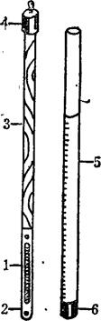 | 释义 | 直管地温计 0.5m深度以下的深层土温,用直管地温计观测(图6-5),地温计的深度即从土表到温度计球部的深度。直管地温计有导热率小的胶木管1为外壳,上端有金属管盖2,管芯是木棒3,下端是固定在木棒上的特制的金属套管4,其中紧密地嵌入温度表,套管内温度表的球部被经由圆孔5垫入的铜屑所包围,圆孔在垫入铜屑后用蜡封住。管心应能自如地插入胶木管,安置时必须使棒上的温度表的套管与金属管盖轻轻接触,这样才能进行正确的观测。但是当木棒插入胶木管时,整个温度计的重力应当落在带圆环的顶帽6上,以免损坏温度计。