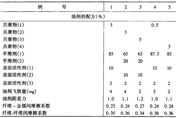 上表中,平滑剂(1)为精制锭子油(60s);平滑剂(2)为棕榈酸-2-乙基己酯。表面活性剂(1)为聚氧化乙烯(5EO)十八烯基醚;表面活性剂(2)为聚氧化乙烯(3EO)十二烷基醚;表面活性剂(3)为十二烷基磷酸酯三乙醇胺盐。 由上表可见,本品在高速纺条件下油剂飞散量很少,其纤维-金属间的摩擦系数、纤维-纤维间的摩擦系数与普通油剂(不含共聚物)几乎相同,或者更好一些。 (日本特许公开:3-40150) |