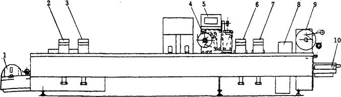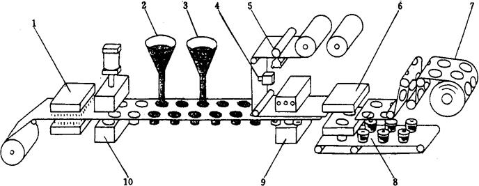 图2-8-3 直线间歇式热成型-充填-封口机工作示意图 1-成型塑片 2-加热装置 3-成型装置 4-覆膜 5-控制箱 6-封合装置 7-冷却器 8-冲裁装置 9-余料收集装置 10-输出装置 图2-8-4所示为直线间歇式热成型-充填-封口机工作示意图。工作时,成型薄膜在主传动机构的驱使下作向前间歇运动。首先,成型薄膜进入加热工位1,加热装置温度可调,当薄膜温度达到预定塑化温度,前进至成型工位10,薄膜被抽吸或压制成预定形状的容器,继续向前至充填工位2充入物料,必要时可采用二次充填。然后移至封合工位热封9,最后抵达冲裁工位6,在此,包装成品被冲裁输出,废膜则由废膜输出装置卷走。