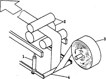 图2-8-5 成型塑膜架 1-气缸 2-送料辊 3-卷料辊 4-张紧辊 夹持器牵引装置如图2-8-6所示,它是利用链条上的针或夹钳使卷料向前移动。