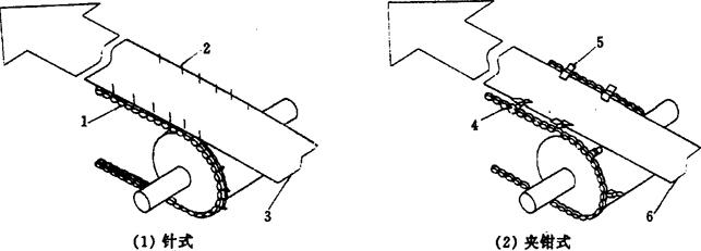 图2-8-6 夹持器牵引装置 1-链条 2-针 3-卷料 4-链条 5-夹钳 6-卷料 2.1.2 成型带式输送装置(图2-8-7)