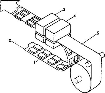 图2-8-7 成型带式输送装置图 1-成型容器 2-成型输送带 3-成型装置 4-预热装置 5-卷料 成型带式输送装置的成型塑膜架机构与夹持器式输送装置基本相同,它利用与容器相吻合的成型带牵引卷料。 2.2 成型装置 常见的成型装置结构如图2-8-8所示。它是由成型模具、支架和传动件组成,集加热、成型为一体。上模内装有远红外加热管,由温控器控制其温度;下模内设有冷却水道及抽气孔,采用负压成型方式。