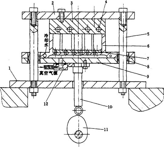 图2-8-8 直线间歇式热成型-充填-封口机的成型装置图 1-底板 2-上板 3-上模 4-加热管 5-导杆 6-下模 7-垫板 8-直线轴承 9-板 10-杆 11-凸轮 12-气管接头 成型模具是成型装置的关键部件。模具的直立面有一定斜度α,阳模为2°~5°;阴模为0°~2°。成型模腔气孔直径d为0.5~1mm。成型的薄壁部位及大平面设有加强筋,以增加容器结构刚性。 2.3 封合装置 间歇地将覆膜与成型容器界面加热、加压,使之密封。容器的周边封口可-次完成,对于真空-充气式,其周边封口常不止一次。典型的封合装置如图2-8-9所示。该装置的传动件和支架与成型装置相似。