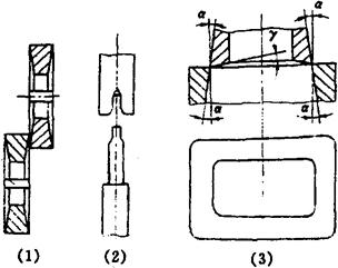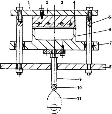 图2-8-9 直线间歇式热成型-充填-封口机的封合装置图 1-上板 2-上封合板 3-电加热管 4-垫 5-导杆 6-下封合板 7-直线轴承 8-下板 9-杆 10-滚轮 11-凸轮 2.4 冲裁装置 常用的冲裁方法有纵裁、横裁和模型裁3种。纵裁多用滚刀方式如图2-8-10(1)所示;横裁多用插刀方式如图2-8-10(2)所示;模型裁刀具如图2-8-10(3)所示。