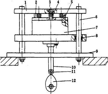 图2-8-11 直线间歇式热成型-充填-封口机的冲裁装置 1-上板 2-压板 3-螺栓 4-弹簧 5-切刀 6-导杆 7-切刀 8-直线轴承 9-板 10-杆 11-滚轮 12-凸轮 |