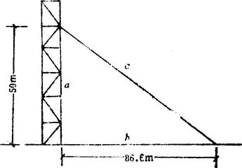 〔计算例〕 某吊装竖立抱杆高度50米,底边86.6米,求绳长度(c)。