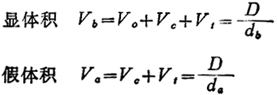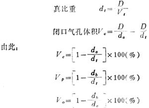 | 释义 | 真比重、假比重、显比重、体积;开口气孔与闭口气孔之间的关系 D——干样重 W——饱水试样重 S——水中称重 Vt——真体积(不包括气孔) Va——假体积(只包括闭口气孔) Vp——总气孔体积 Vo——开口气孔体积 Vc——闭口气孔体积 Vb——显体积(包括闭口气孔与开口气孔) da——假比重 db——显比重 dt——真比重 闭口气孔体积Vc=Va-Vt 开口气孔体积Vo=Vb-Va 总气孔体积Vp=Vc+Vo=Vb-Vt