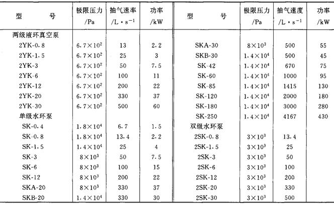| 释义 | 真空泵 (一)水环式真空泵 1.结构特点 利用泵壳和叶轮的不同心安装结构,当叶轮旋转时,构成与叶轮成偏心的水环;在固定的吸气口与排气口的相应配合下,完成吸气、压缩与排气。该种型式的真空泵有单级与双级之分,双级泵是一级的排气被二级吸入,压缩并排出。 2.主要技术参数 2YK、SK及2SK型水环式真空泵见表9-9-24所示; 表9-9-242YK、SK水环泵性能表