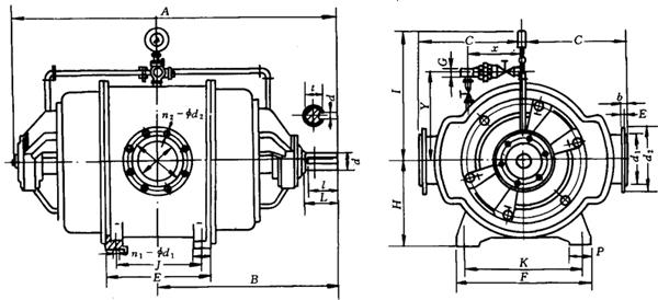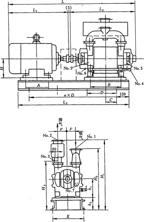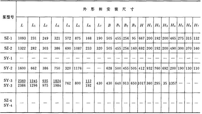 图9-9-24 SZ-3 SZ-4 SY-3 SY-4型泵与压缩机外形尺寸图 表9-9-30 SZ SY型泵和压缩机外形和安装尺寸表 单位:mm